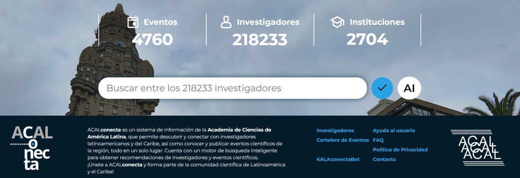 ACALconecta, una plataforma de la Academia de Ciencias de América Latina (ACAL), es un sistema de información que facilita la conexión y el descubrimiento de investigadores latinoamericanos y del Caribe. Además, permite conocer y publicar eventos científicos de la región en un solo lugar. La plataforma cuenta con un motor de búsqueda inteligente que ofrece recomendaciones personalizadas de investigadores y eventos científicos.